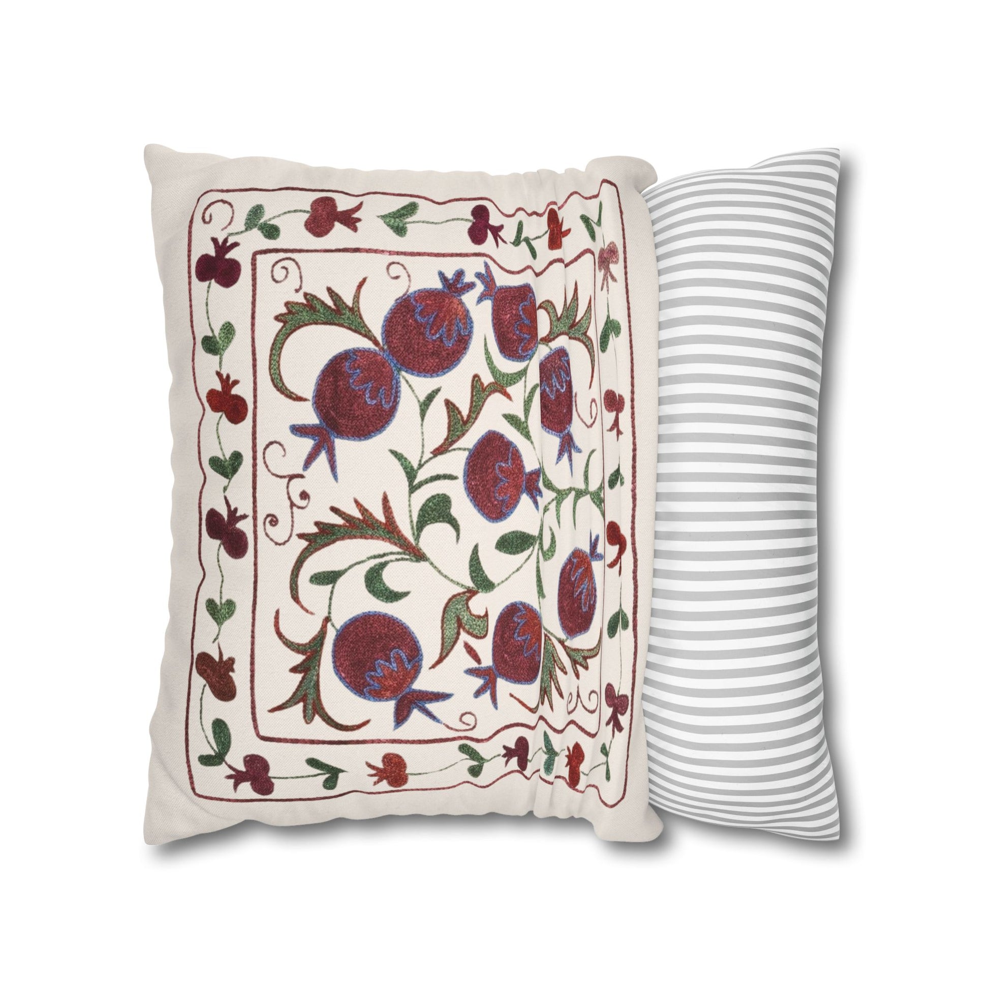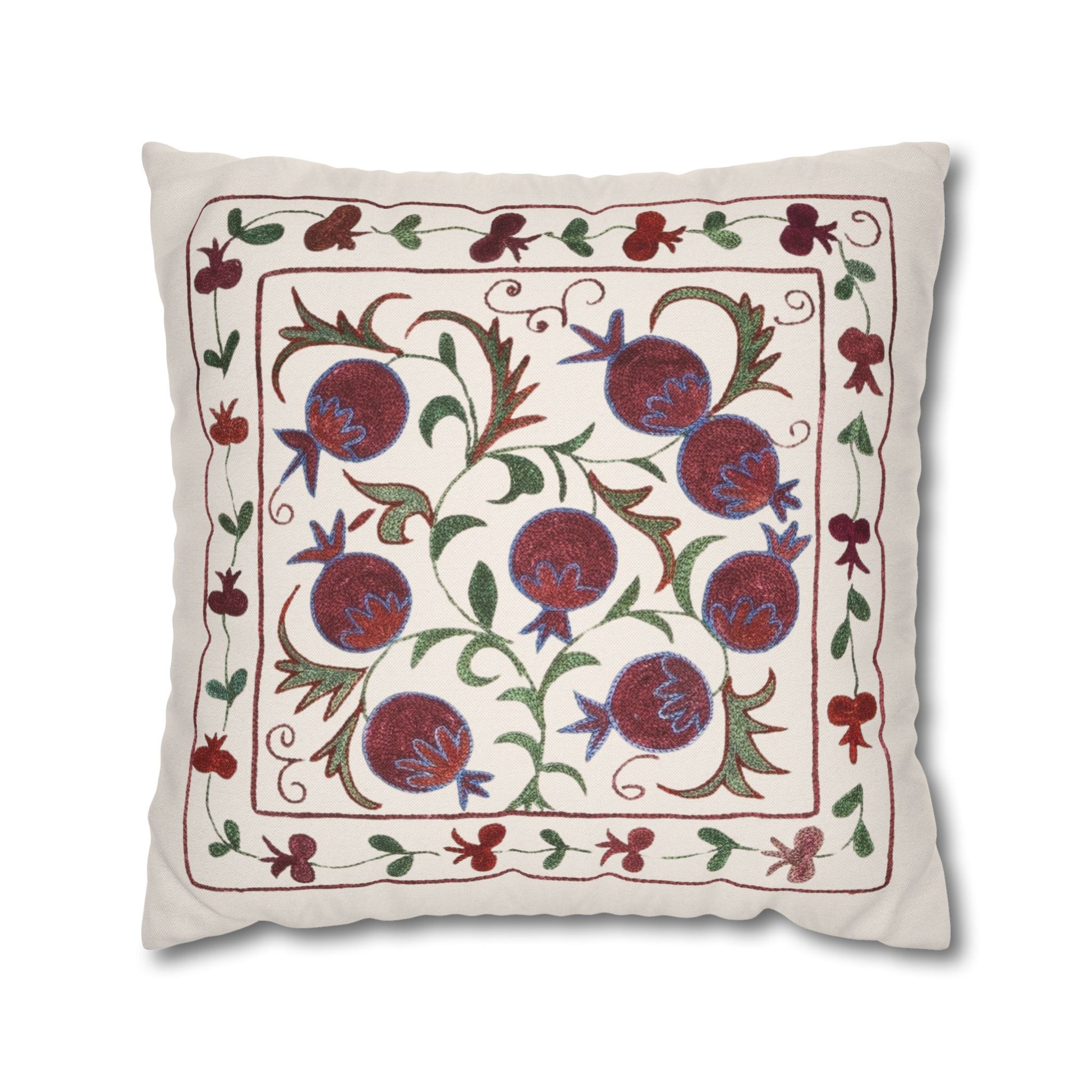 Add a touch of timeless heritage to your space with this Ottoman-inspired pillow cover featuring a digitally printed pomegranate motif - a symbol of abundance and beauty in Middle Eastern design. Pomegranate is a rich symbol in these cultures as it is recognized as a holy and blessed fruit. The intricate details mimic traditional embroidery with a modern printed finish, offering both charm and comfort. Perfect for layering in a boho, Mediterranean, or traditional home, this piece blends rich history with warm, earthy elegance.